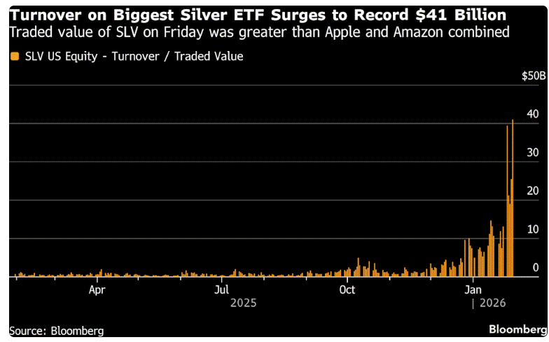 the previous record peak weekly volume from the silver top in 2011. On Friday, SLV traded $41 billion while just