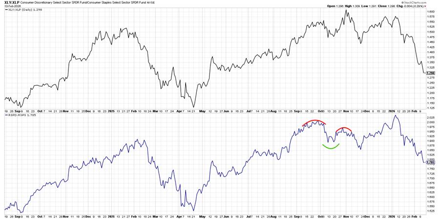 Consumer Discretionary (XLY) vs. Consumer Staples (XLP) sectors. Both of these ratios have been trending lower since the