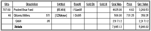Original cost: $ 8,090.45 Present value: $ 5,946.02 Increase: $-2,144.43 [-26.51%]The performance of this portfolio and its predecessors ("Hedger's Delight", "Present and Future Income", "Crapshooter's Folly") from January 1987 to the present is -16.66%, for a compound annual rate of return of -1.48%.